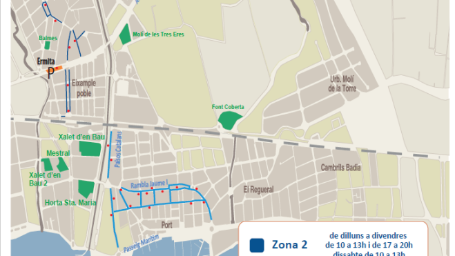 Pg. Albert, av. Independència (tram des de la pl. Carles Roig al c. del Sindicat), pl. Carles Roig, av. Vidal i Barraquer, av. Verge de Montserrat, Jacint Verdaguer, Pere III, del Vi i la zona taronja (Aparcament de l’Ermita).