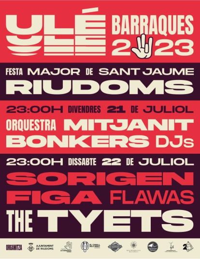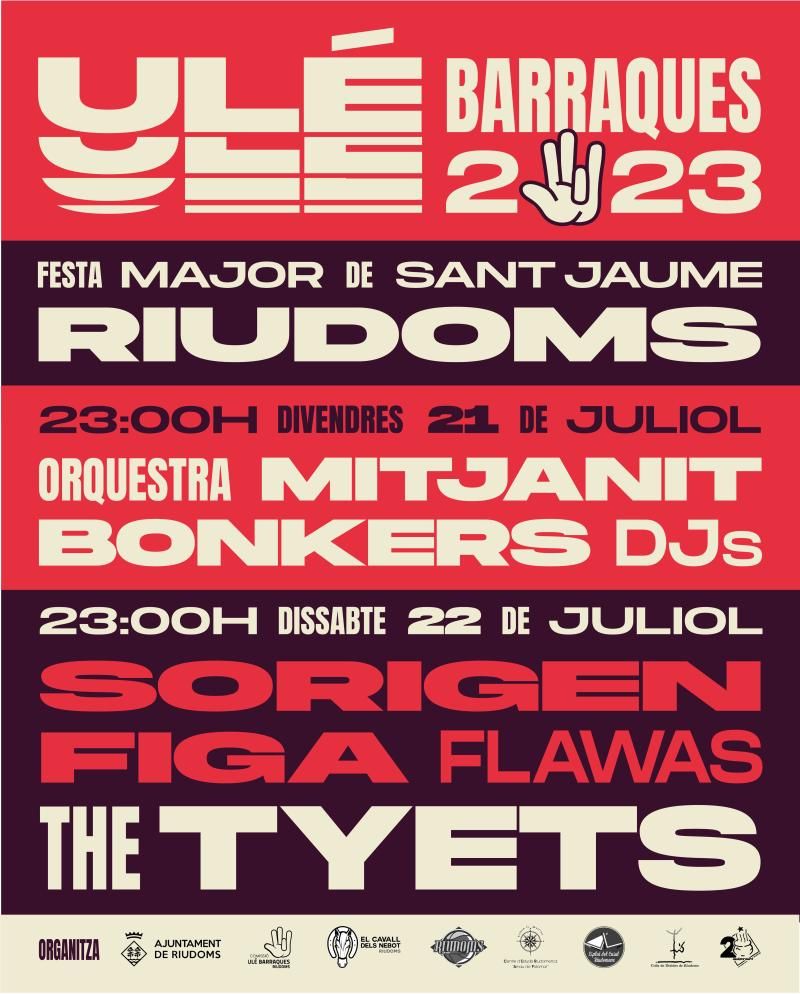 Les Ulé Barraques Riudoms 2023 després de 15 edicions, estan a punt de tornar a fer vibrar la música en directe amb un cartell excepcional. La Festa Major de Sant Jaume que se celebrarà el 21 i 22 de juliol, té ja confirmada la presència de The Tyets, una de les bandes que lidera l'escena musical catalana.