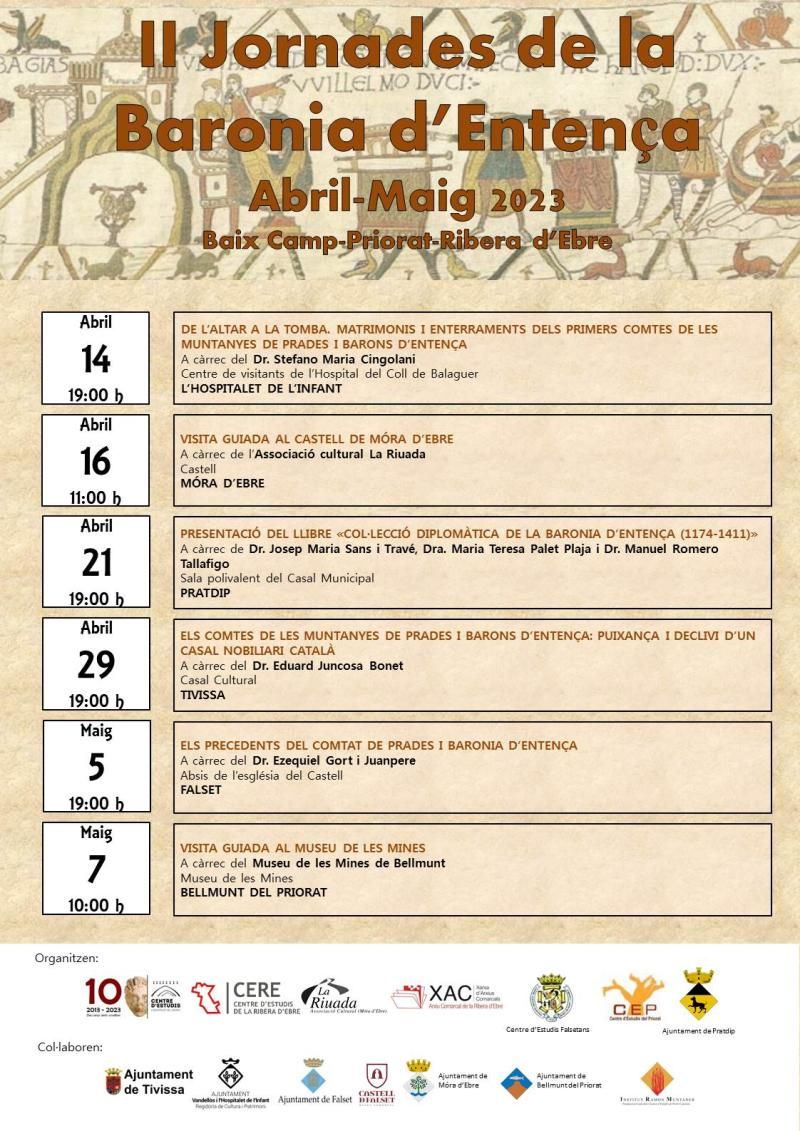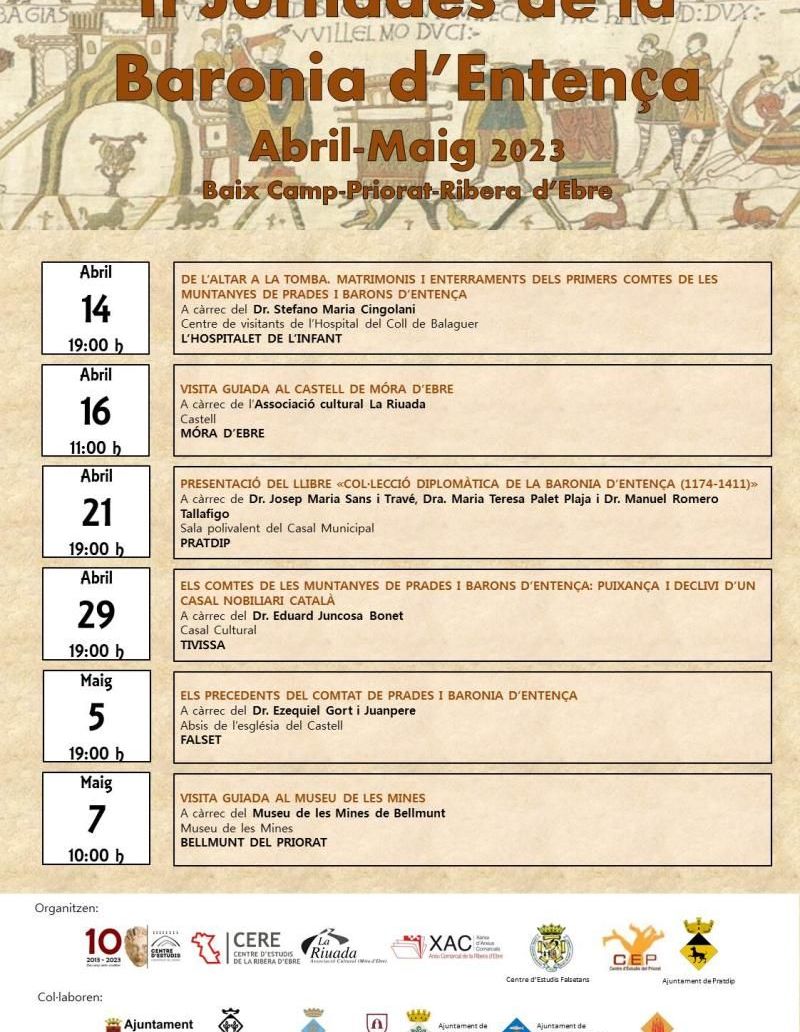Aquí podeu consultar el PROGRAMA COMPLET de les II Jornades de la Baronia d'Entença, que se celebraran durant els mesos d'abril i de maig i que inclouen tres conferències (a l'Hospitalet de l'Infant, a Tivissa i a Falset), la presentació d’un llibre a càrrec d’historiadors experts en la història de la baronia (a Pratdip) i dues visites guiades a alguns dels elements patrimonials de l’època (al Castell de Móra d'Ebre i al Museu de les Mines de Bellmunt del Priorat).