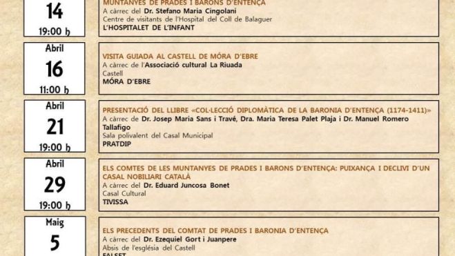 Aquí podeu consultar el PROGRAMA COMPLET de les II Jornades de la Baronia d'Entença, que se celebraran durant els mesos d'abril i de maig i que inclouen tres conferències (a l'Hospitalet de l'Infant, a Tivissa i a Falset), la presentació d’un llibre a càrrec d’historiadors experts en la història de la baronia (a Pratdip) i dues visites guiades a alguns dels elements patrimonials de l’època (al Castell de Móra d'Ebre i al Museu de les Mines de Bellmunt del Priorat).