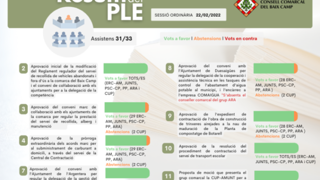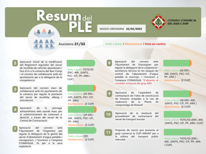 Per altra banda, la sessió plenària també ha aprovat per unanimitat el punt referent a la resolució del procediment per la contractació del servei de transport escolar per al curs vinent. Mentre que el punt sobre la contractació de l'obra de construcció de trinxeres airejades a la nau de maduració de la Planta de compostatge de Botarell ha estat aprovada pels grups polítics  ERC-AM, JUNTS, PSC-CP, PP, Ara i l'abstenció de la CUP-AMUNT.