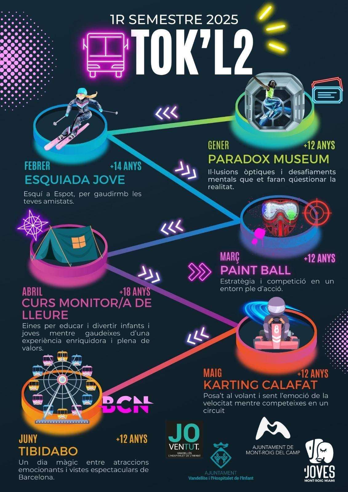 Les regidories de Joventut dels ajuntaments de Mont-roig del Camp i Vandellòs i l'Hospitalet de l'Infant ja han donat a conèixer el calendari del programa Tok'l 2, corresponent al 1r semestre de 2025. Un programa d’activitats adreçat als joves dels dos municipis amb què pretenen oferir-los experiències enriquidores i divertides cada mes.