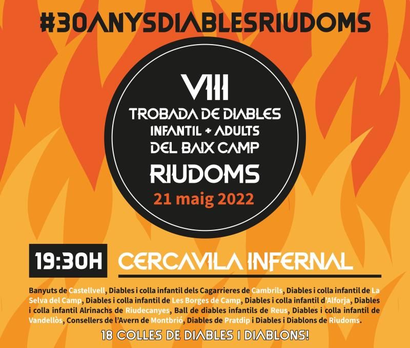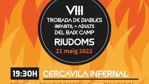 Riudoms serà, el pròxim dissabte 21 de maig, la seu de la celebració de la VIII Trobada de Diables del Baix Camp. Aquesta congregació de Colles de Diables farà que un total de 18 colles (8 infantils i 10 adultes) d'arreu de la comarca es reuneixin a Riudoms per celebrar la tradicional trobada, després de dos anys sense poder-se celebrar a causa de la pandèmia.