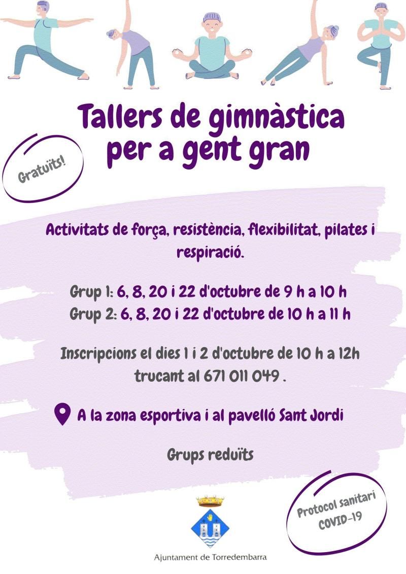 La Regidoria d’Acció Social de l'Ajuntament de Torredembarra, amb la col·laboració de la Regidoria d’Esports, ha programat uns tallers gratuïts d’activitat física per a la gent gran, de caire puntual. S’han previst durant aquest període de pandèmia per la Covid-19 i les actuals mesures de seguretat sanitària, que no permeten iniciar l’habitual activitat de gimnàstica per a la gent gran que s’organitza cada any. Segons ha explicat la regidora d’Acció Social, Marga Rovira, amb aquests tallers s’ajuda aquest col·lectiu de persones a mantenir una bona forma física tan necessària per a la salut.