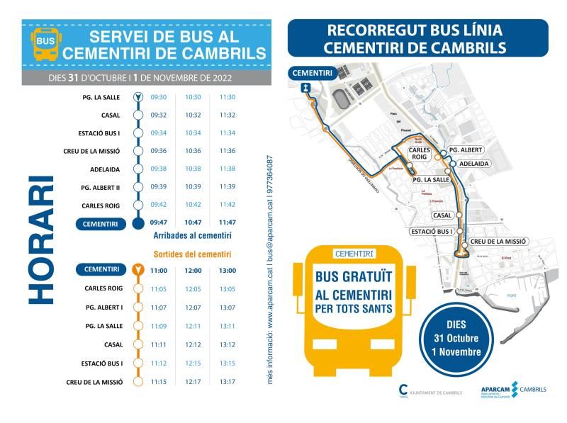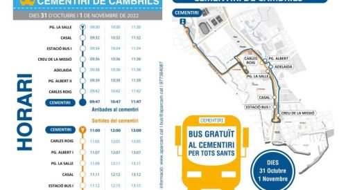 L’Ajuntament de Cambrils oferirà el servei especial d’autobús gratuït per anar al cementiri els dies 31 d’octubre i 1 de novembre amb motiu de la festa tradicional de Tots Sants. L’autobús urbà farà tres viatges diaris d’anada i tornada per facilitar el desplaçament a les persones que vulguin anar a recordar els seus difunts. Els horaris i el mapa del recorregut del bus llançadora es poden descarregar des del web d’Aparcam https://www.cambrils.cat/