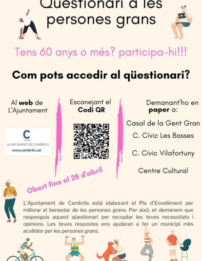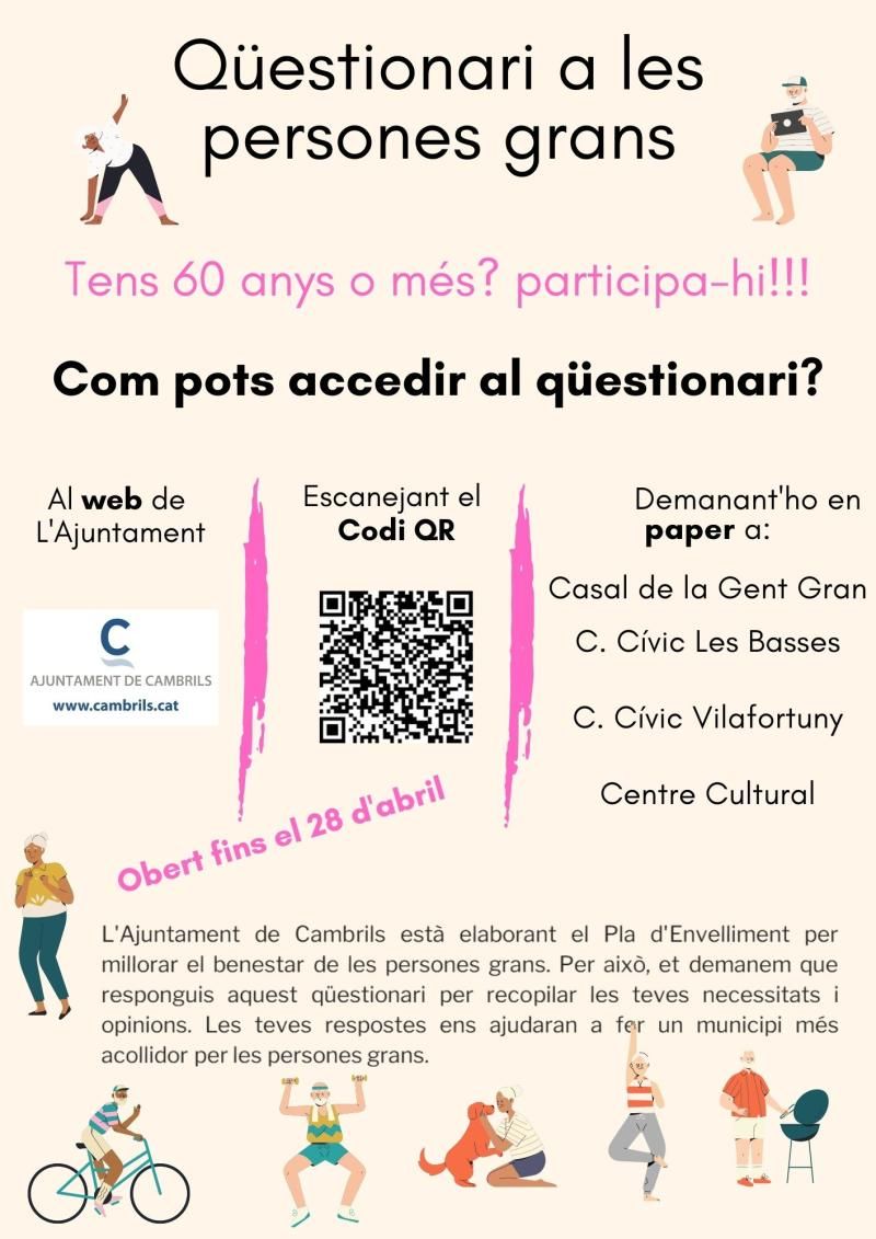 El qüestionari, totalment anònim i confidencial, es pot respondre fins al 28 d’abril a través de l’enllaç que s’ha difós des del web de l’Ajuntament, les xarxes socials corporatives i diversos cartells amb un codi QR o bé emplenant les enquestes en paper que s’han distribuït per diferents equipaments del municipi: Casal de la Gent Gran, Centre Cívic Les Basses, Centre Cívic Vilafortuny, i Centre Cultural.