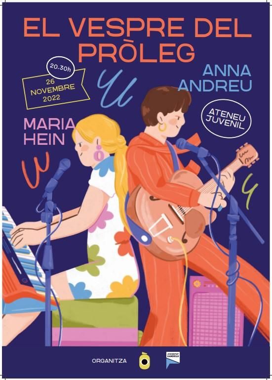 Les cantautores Maria Hein i Anna Andreu actuaran al Vespre del Pròleg de Cambrils el pròxim 26 de novembre a partir de les 20:30 hores a la sala de concerts de l’Ateneu Juvenil. Les entrades es poden comprar de forma anticipada a través del web https://entradium.com a 5€, a través d’entradium.com, i a 8€ el mateix dia.