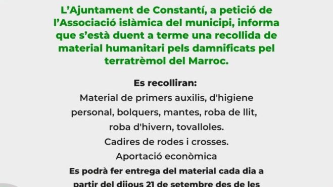 Des d’aquesta setmana es pot col·laborar en una campanya de recollida de material humanitari pels damnificats pel terratrèmol del Marroc del passat 8 de setembre. Segons ha informat l’Ajuntament de Constantí, es recollirà material de primers auxilis, d'higiene personal, bolquers, mantes, roba de llit, roba d'hivern, tovalloles, cadires de rodes i crosses i aportació econòmica.
