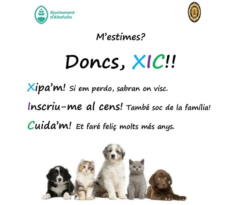 L’Ajuntament d’Altafulla i la Policia Local han iniciat la campanya ‘M’estimes? Doncs, XIC!’, que facilita al propietaris d’animals de companyia la identificació i el registre de les seves mascotes al cens municipal i permet tenir accés a les seves dades en casos de pèrdua, fugida o abandonament.