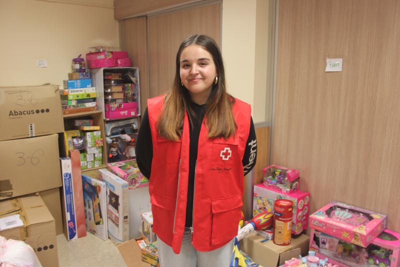 Vam parlar amb Anna Medina, que fa 2 anys que és voluntària i és el seu segon Nadal. Enamorada de la seva feina, es nota com gaudeix molt d'aquesta tasca d'ajudar als nens. Ens va explicar com preparen les bosses, a cada bossa i fiquen tres joguines, una cooperativa, una més lúdica i una educativa. A vegades i fiquen una quarta addicional en funció del volum que disposin aquell any. Tenen un magatzem on divideixen les joguines per edats, així els hi és molt més fàcil a l'hora de fer les bosses per a cada família. La franja d'edat més elevada és la que costa més de recollir, llavors han d'anar agafant joguines que tenen emmagatzemades de la resta de l'any. Molts cops els hi arriben donacions fora de la campanya de Nadal, llavors el que fan és guardar-les per quan es necessitin. Durant tot l'any han de tenir estoc, perquè hi ha gent que o bé per aniversaris o perquè les necessitin, acudeixen a la Creu Roja perquè els hi ajudin. Ens explica també que recullen durant tot l'any, els portadors principalment són grans magatzems o llibreries que els hi donen.