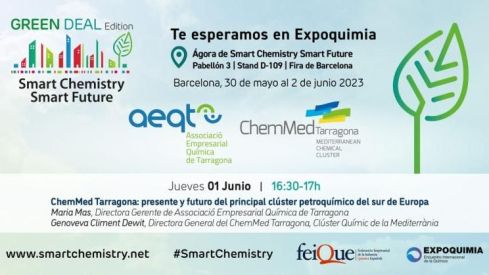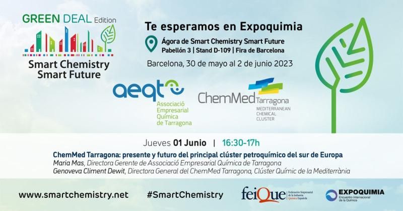 El clúster ChemMed i l’Associació Empresarial Química de Tarragona (AEQT) participen des d’aquest dimarts 30 de maig i fins divendres 2 de juny en una nova edició d’Expoquimia, la trobada internacional de la química que una vegada més se celebra al recinte Gran Via de Fira Barcelona. El clúster petroquímic de Tarragona participa en aquest esdeveniment, el més important del sector a nivell estatal, com a part de l’espai Smart Chemistry Smart Future que lidera Feique (Federació Empresarial de la Indústria Química Espanyola), i que, sota el lema Green Deal Edition, estarà centrat a visibilitzar com el sector està liderant el desenvolupament d'importants solucions innovadores i disruptives que contribuiran decisivament a accelerar la transició cap a una economia sostenible i digital.