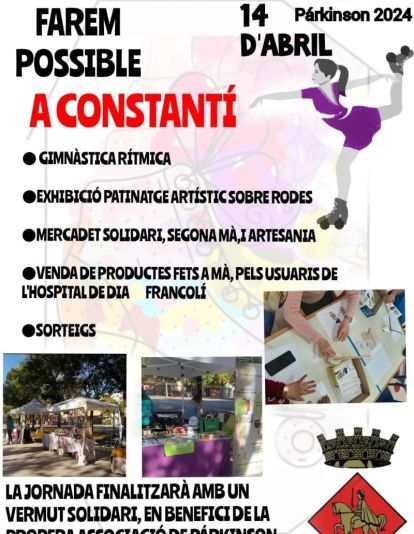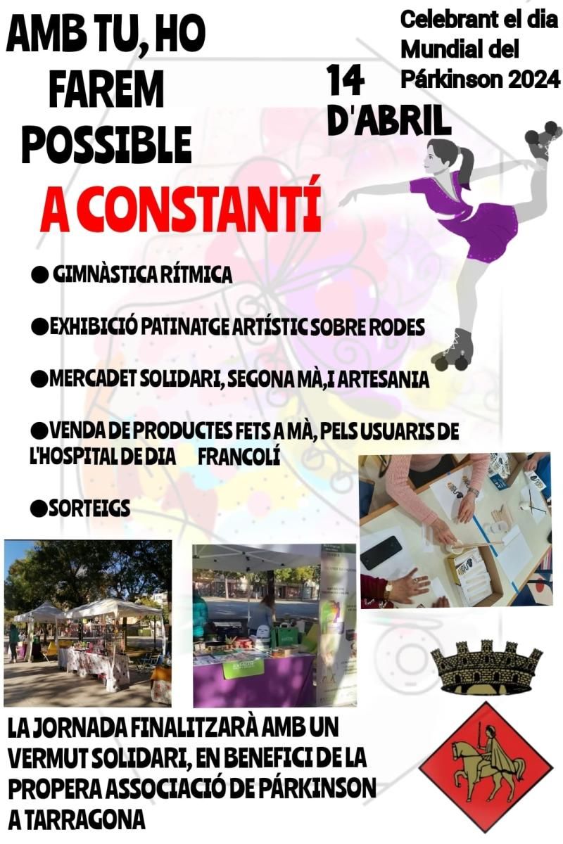 Amb el lema “Amb tu, ho farem possible”, la jornada s’iniciarà a les 11 h al carrer Major i comptarà amb la col·laboració del Club Gimnàstica Estètica i Rítmica Constantí i del Club Patí Constantí. Durant tot el matí s’instal·laran parades d’artesania i un mercat de productes de segona mà, i també es posaran a la venda diversos productes fets a mà per les persones usuàries de la unitat de Parkinson precoç de l’Hospital de dia del Centre Sociosanitari Francolí. També hi haurà actuacions musicals i un vermut solidari.