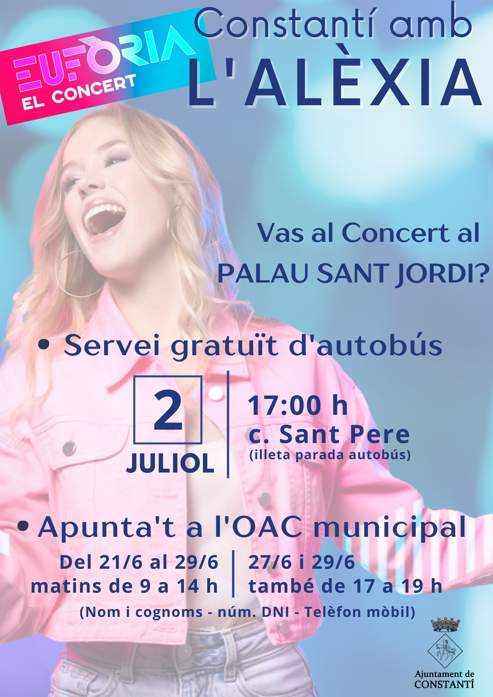 L'Ajuntament de Constantí ofereix un servei gratuït d’autobús per a totes aquelles persones que tinguin una entrada per assistir al concert d’Eufòria al Palau Sant Jordi de Barcelona, que tindrà lloc el diumenge 2 de juliol.