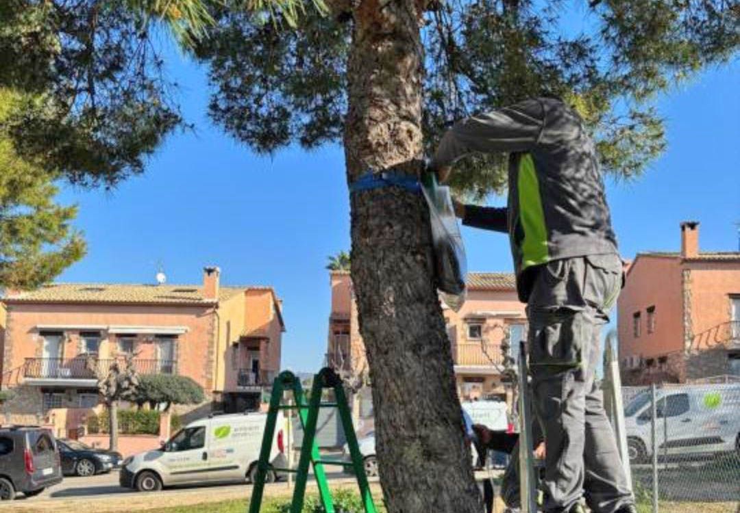 Durant les primeres setmanes de febrer s’ha dut a terme la retirada de les bosses presents a les copes dels pins mitjançant llança extensible i, posteriorment, la instal·lació d’anelles de captura per interceptar el descens de les erugues. Aquestes actuacions completen el tractament correctiu previst.