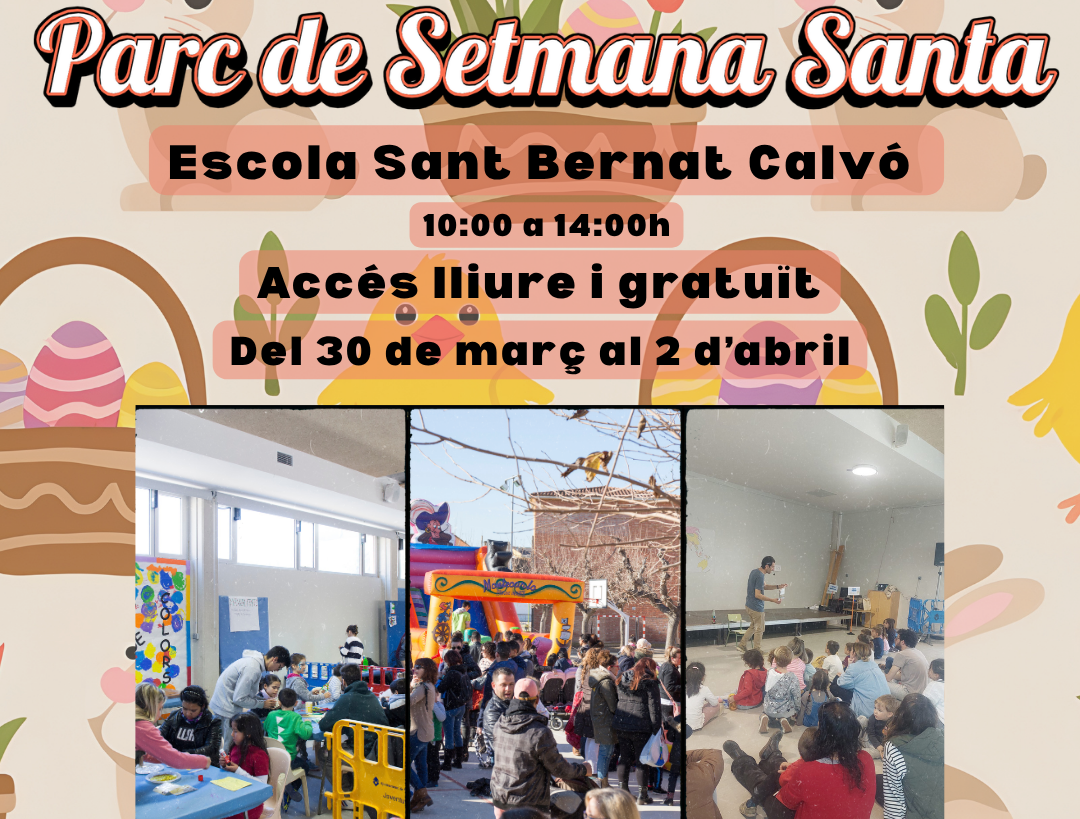 L’horari del parc serà des de les 10.00 a les 14.00 h i comptarà amb accés lliure i gratuït. En aquest sentit, cal recordar que el pati de l’Escola Sant Bernat Calvó també estarà obert entre el 30 de març i el 6 d’abril, d’11.00 a 14.00 h i de 16.00 a 19.00 h, perquè de forma lliure els infants i les famílies gaudeixin d’un espai de joc, oci i convivència en el marc del projecte Patis Oberts. Cal recordar que el Parc de Setmana Santa és organitzat per la regidoria de Joventut de l’Àrea de Drets Socials de l’Ajuntament de Vila-seca.
