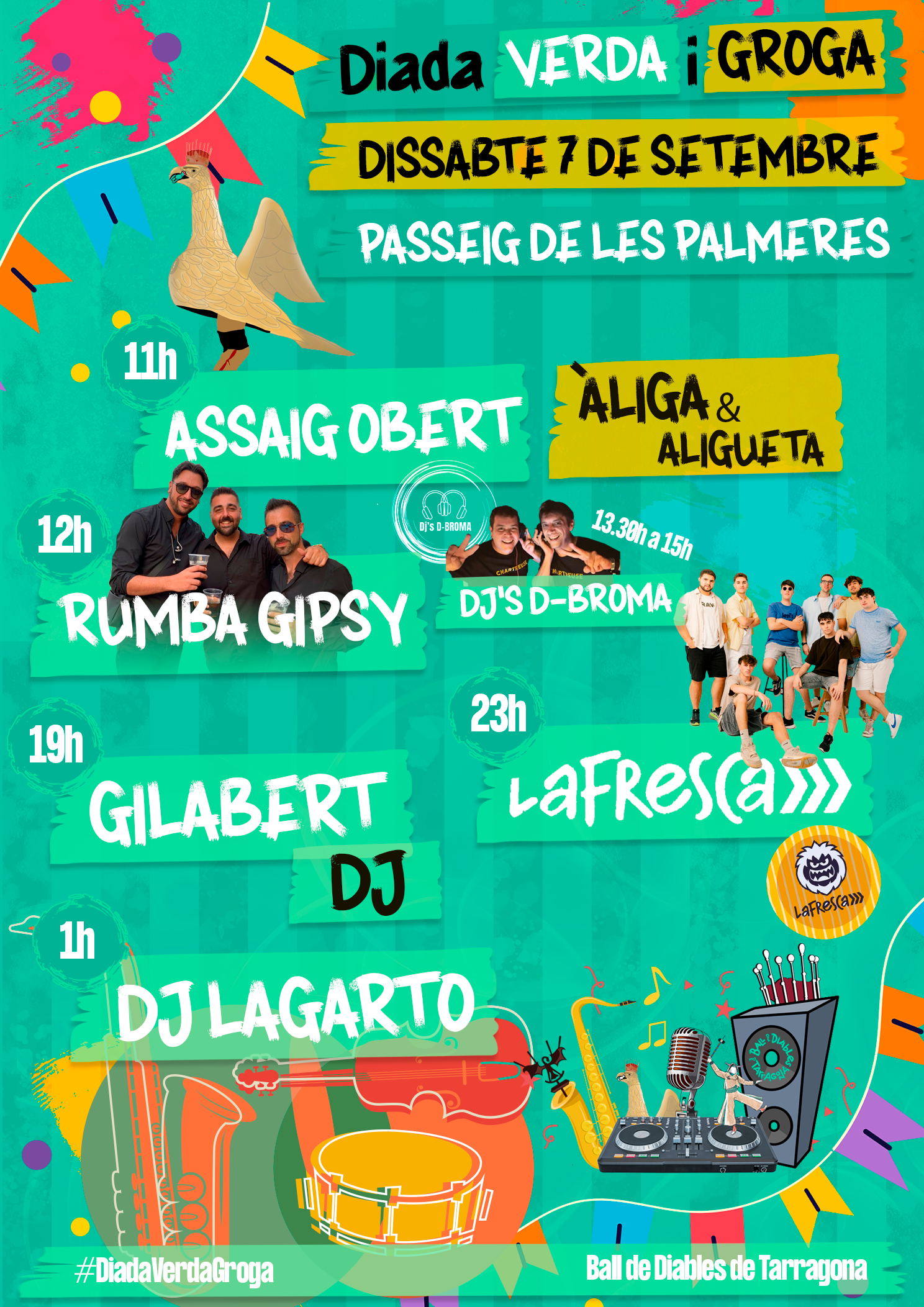 El dissabte, 7 de setembre, el Passeig de les Palmeres s'omplirà de color, música i tradició amb la celebració de la Diada Verda i Groga del Ball de Diables de Tarragona. El nom de l'esdeveniment prové dels colors corporatius de les dues seccions de l'entitat. El verd dels diables i el groc de l'Àliga. Serà precisament l'Àliga i com a novetat enguany, l'Aligueta qui donarà tret de sortida als actes amb un assaig obert que permetrà tothom qui ho vulgui fer ballar aquestes peces.