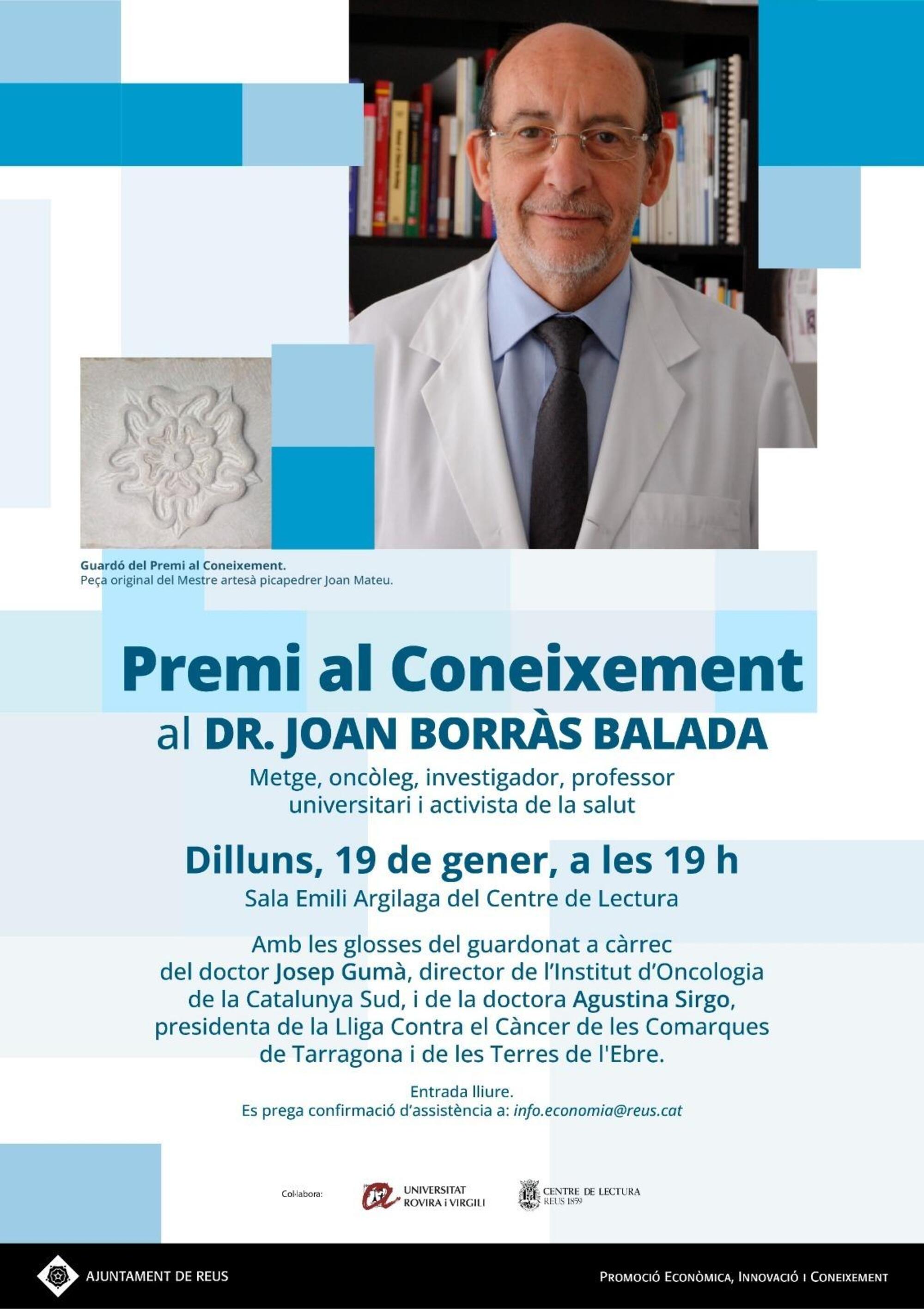La ciutat de Reus reconeixerà enguany una de les figures més rellevants de la medicina i la recerca oncològica del territori. La Regidoria de Promoció Econòmica, Innovació i Coneixement de l’Ajuntament ha concedit el Premi al Coneixement 2026 al Dr. Joan Borràs Balada, director adjunt de l’Institut d’Oncologia de la Catalunya Sud (IOCS) de l’Hospital Universitari Sant Joan de Reus.