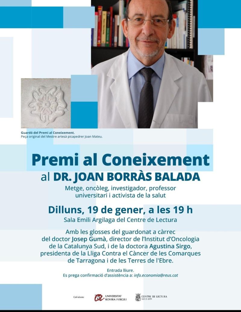 L’acte de lliurament del Premi al Coneixement 2026 tindrà lloc el dilluns 19 de gener, a les 19 h, a la Sala Emili Argilaga del Centre de Lectura de Reus, en el marc d’una cerimònia de caràcter acadèmic. L’esdeveniment servirà per reconèixer la dedicació del Dr. Borràs a la ciutadania reusenca i, al mateix temps, per posar en valor el paper de la universitat i, de manera especial, de la Facultat de Medicina i Ciències de la Salut de la Universitat Rovira i Virgili.