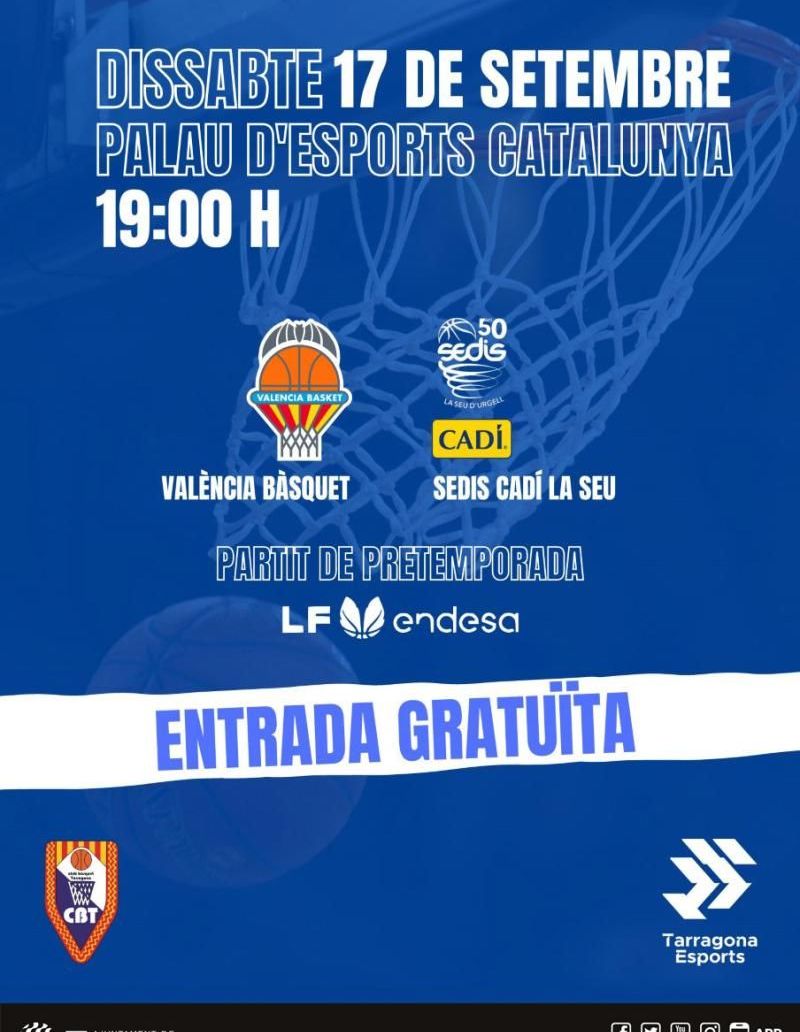 El pròxim dissabte 17 de setembre a les 19 h, el Palau d’Esports Catalunya acollirà el partit de pretemporada de la lliga femenina de bàsquet entre el València Bàsquet i el Sedis Cadí La Seu. Aquest esdeveniment coorganitzat per Tarragona Esport i el Club Bàsquet Tarragona, estrenarà la temporada esportiva del palau, que els dies 20 i 21 de setembre serà la pista de les semifinals i final de la Lliga catalana ACB AON.