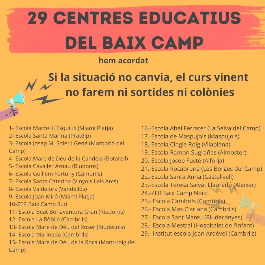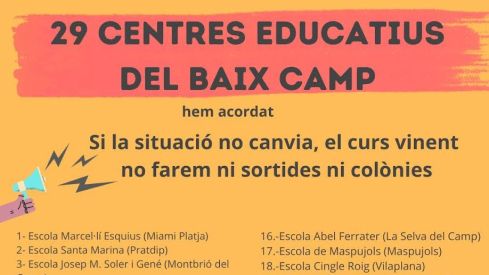 La Junta de Directors del Baix Camp Sud i Nord denuncia que l'augment de la complexitat educativa, la sobrecàrrega organitzativa i la insuficiència de personal dificulten garantir aquestes activitats amb seguretat i qualitat. Per això, 29 escoles del Baix Camp han decidit que si la situació "no canvia" no faran ni sortides ni colònies el curs 2026-2027.
