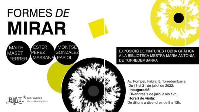 La Regidoria de Cultura de l’Ajuntament de Torredembarra presenta l’exposició de pintures i obra gràfica «Formes de mirar» de Maite Maset Ferrer, Ester Pérez Masana i Montse Gonzàlez Papiol, que es podrà visitar de l’1 al 31 de juliol, a la Biblioteca Mestra Maria Antònia.
