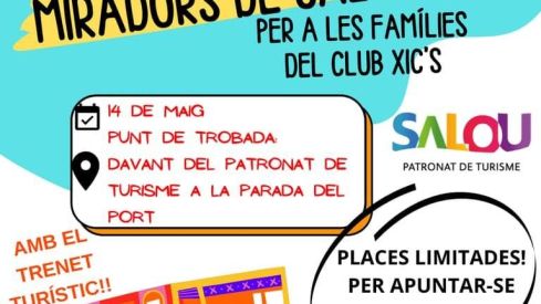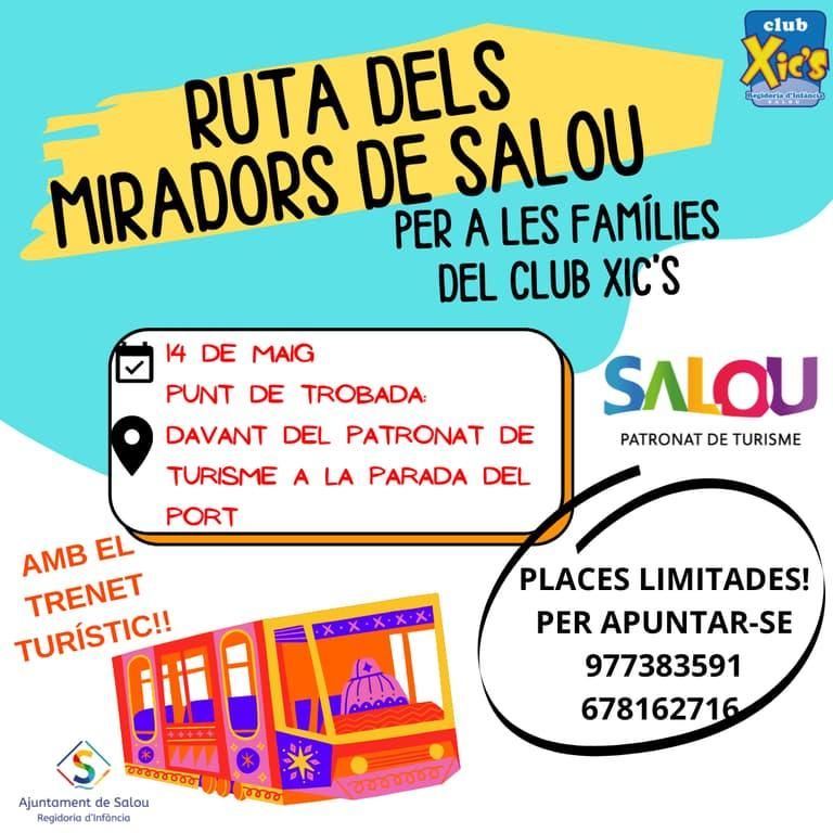 La regidoria d’Infància, junt amb el Patronat Municipal de Turisme i l’Alcaldia de l’Ajuntament de Salou, han organitzat l’activitat de la Ruta dels Miradors, el proper dissabte, 14 de maig, al matí, que es farà amb el Trenet Turístic. Aquesta acció s’adreça, exclusivament, a les famílies que formen part del Club Xic’s.