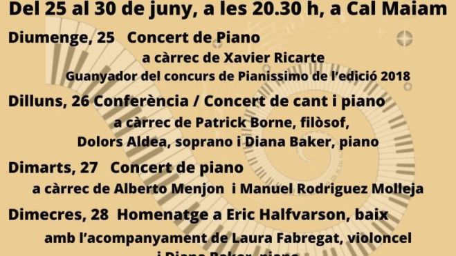 Del 25 de juny al 30 de juny, de 14 a 19 h: Classes magistrals a càrrec del pianista Pedro Carboné i Diana Baker. Més informació a pianissimo.info@gmail.com