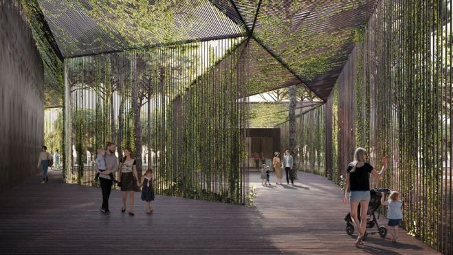 L’edifici s’ha concebut com un conjunt volumètric format per diferents espais funcionals elevats sobre una plataforma situada a 90 centímetres sobre el terreny. Aquesta estructura estarà coberta per una envolvent vegetal zenital que farà funció d’umbracle.