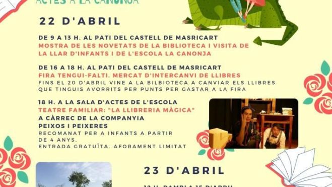 La Biblioteca Pública de la Canonja, per la seva banda, ho celebrarà traient com sempre una mostra de les novetats bibliogràfiques al pati del Castell de Masricart i, al matí, rebrà els infants de la Llar i alumnes de l’escola. A la tarda, enguany recuperarà la fira d’intercanvi de llibre Tengui-Falti. Qui hi vulgui participar té fins el dia 20 d’abril per portar a la biblioteca els llibres que ja tingui avorrits per obtenir punts que podrà canviar per altres llibres el dia 22, de 4 a 6 de la tarda, al pati del Castell de Masricart o a la mateixa biblioteca al llarg de l’última setmana d’abril.