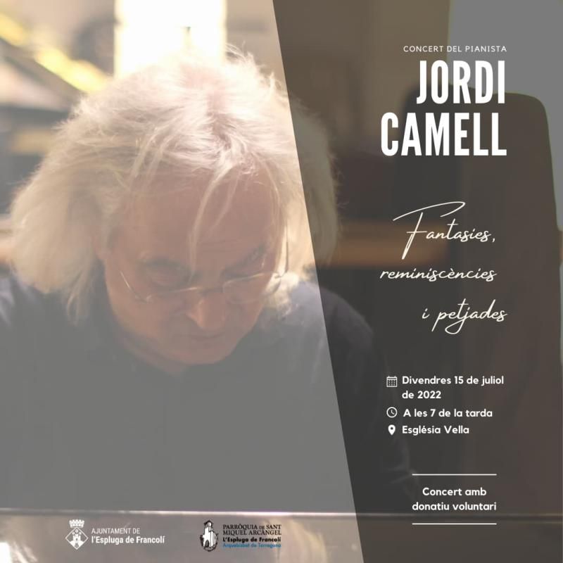 El divendres 15 de juliol a les set de la tarda l’Espluga de Francolí tornarà a gaudir de la presència i la música de Jordi Camell. El pianista del Penedès interpretarà a l’Església Vella diferents obres musicals que es dividiran en tres parts, aquestes sota els títols de “Fantasies, reminiscències i petjades”, i on es podran escoltar peces pròpies i de compositors il·lustres com J. S. Bach, L. v. Beethoven i Claude Debussy.