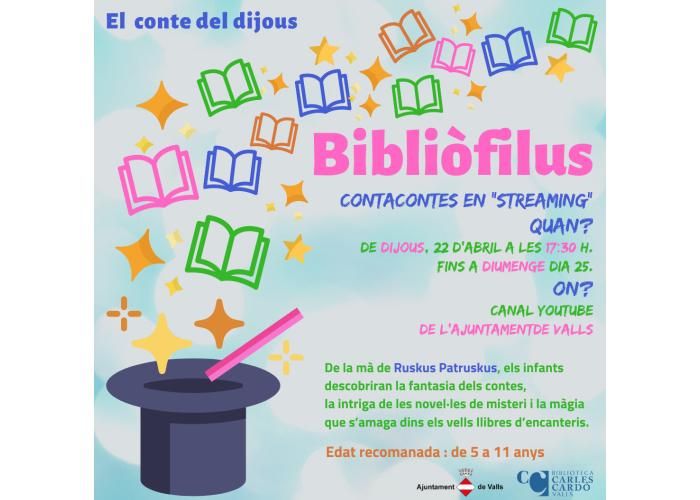 La Biblioteca Carles Cardó ha organitzat una nova sessió de contacontes, aquest cop Ruskus Patruskus serà l'encarregat d'explicar la història de Bibliòfilus, que ens portarà a l’amor pels llibres i la lectura. Els infants descobriran la fantasia dels contes, la intriga de les novel·les de misteri i la màgia que s’amaga dins els vells llibres d’encanteris.