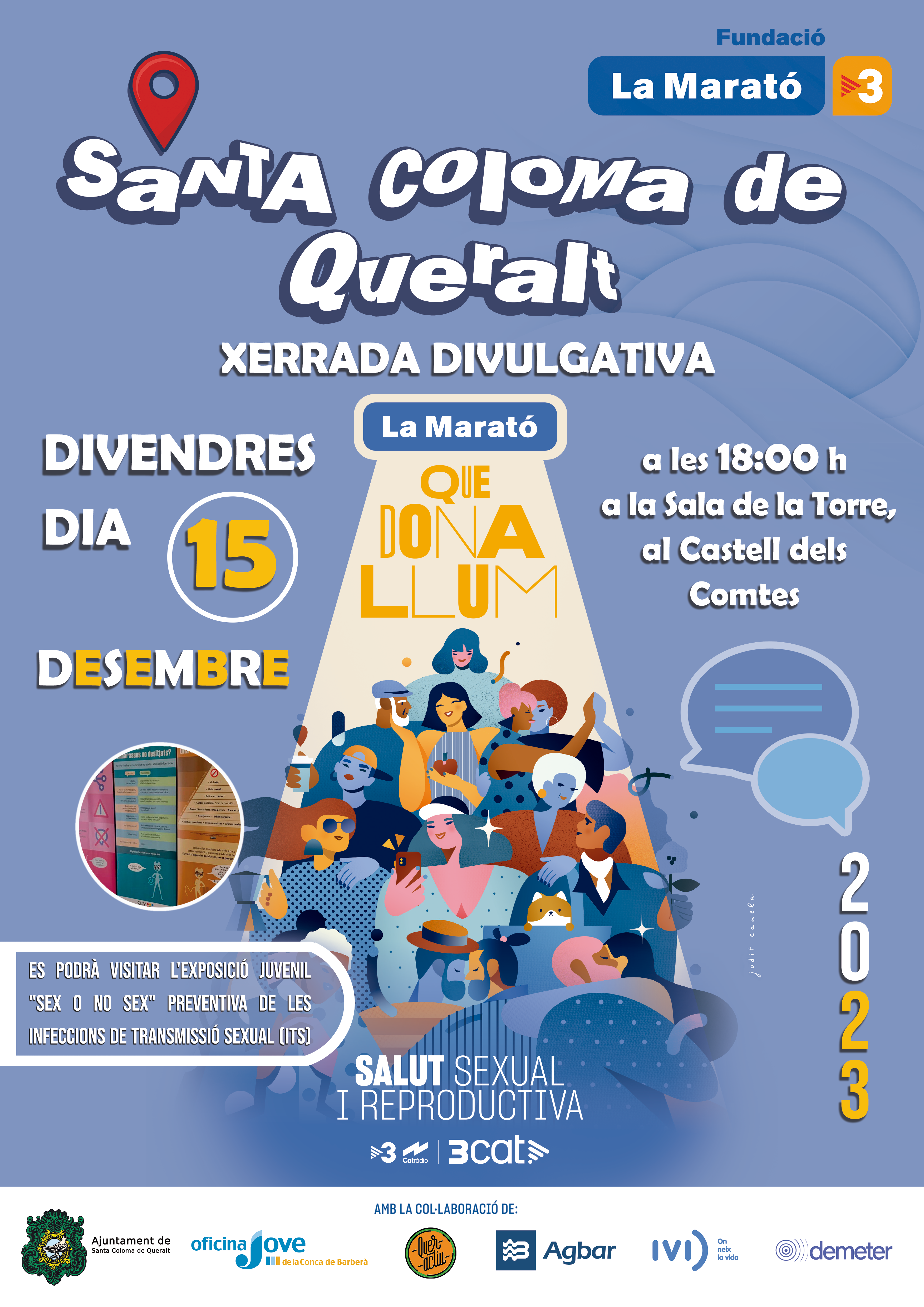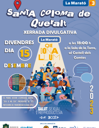 Divendres 15 de desembre, a les 6 de la tarda, a la sala de la torre del Castell dels Comtes de Santa Coloma de Queralt, tindrà lloc la xerrada sobre salut sexual i reproductiva que s'emmarca dins la campanya de divulgació i sensibilització que impulsa la Fundació La Marató de TV3. La xerrada és oberta tant a les persones adultes com a les persones joves.