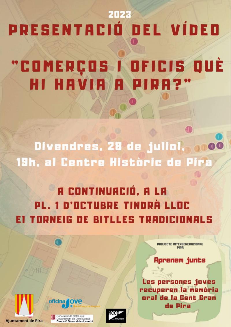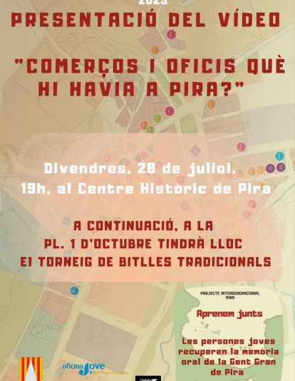 El divendres 28 de juliol, a les 7 de la tarda, al Centre Històric de Pira, tindrà lloc la presentació del vídeo participatiu intergeneracional enregistrat durant la Setmana Santa sobre la recuperació de la memòria oral de la gent gran de Pira pel que fa als comerços i als oficis que hi havia antigament.