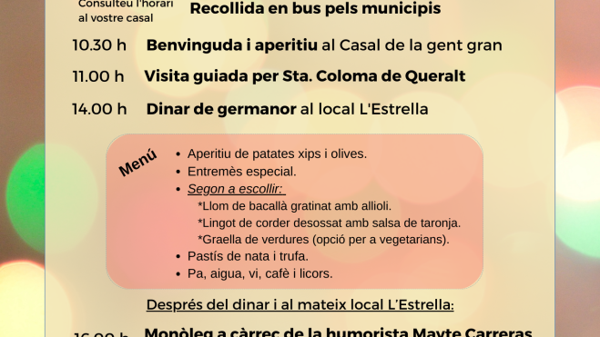 Pel 28 octubre l'Associació de jubilats, jubilades i pensionistes de Santa Coloma de Queralt, com a amfitrió de la trobada, té programada tota una jornada plena activitats tals com una visita guiada pel municipi. També, un dinar de Germanor, un monòleg per hora del cafè i no faltarà espai per ballar amb el duo en viu que van contractar especialment per aquesta trobada. A més a més, aprofitant que, durant aquest cap de setmana oferiran diverses activitats culturals al municipi, hi haurà temps per passejar i gaudir d'ambient festiu que oferirà Sta. Coloma de Queralt el dissabte 28.
