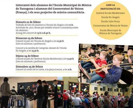 Aquesta setmana, Tarragona acull una quinzena d’alumnes del Conservatori de Voiron (França) que realitzen un intercanvi amb l’alumnat de l’Escola Municipal de Música de Tarragona. L’institut escola Mediterrani i l’escola Els Àngels seran els encarregats d’acollir als joves músics francesos que celebraran quatre concerts durant la seva estada a la ciutat, dos d’ells als centres educatius amfitrions.