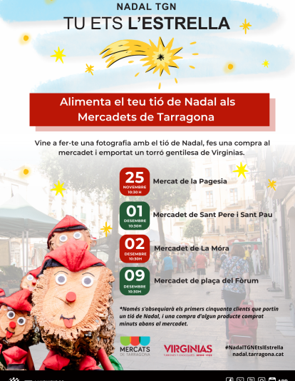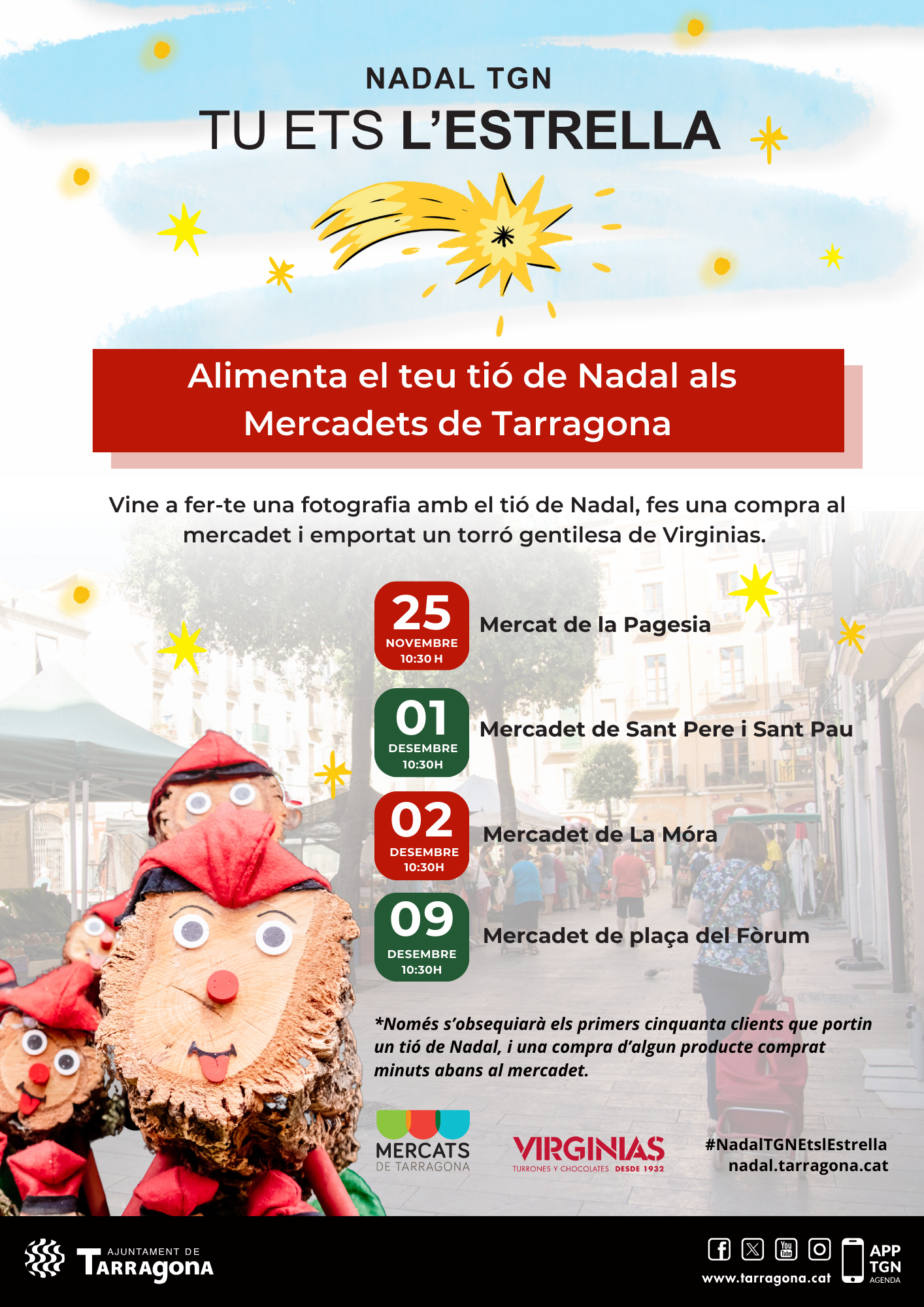 En el marc de les festes nadalenques i per primera vegada, l’empresa Mercats de Tarragona proposa l’acció de dinamització ‘Alimenta el teu tió de Nadal als Mercadets de Tarragona’. És una iniciativa que convida la ciutadania a visitar alguns dels mercadets de la ciutat amb el tió de Nadal, comprar productes locals i de proximitat i, gràcies a la col·laboració amb l’empresa Virginias, Torrons i Xocolates des de 1932, s’obsequiarà amb un torró als primers cinquanta clients.