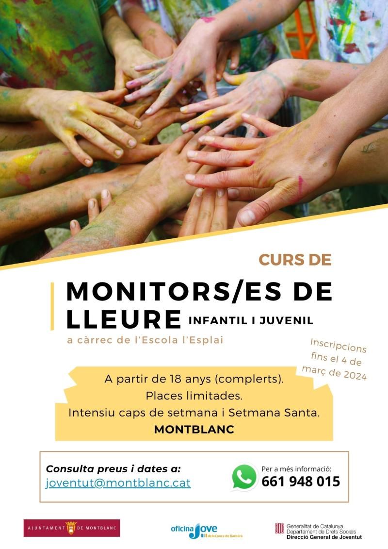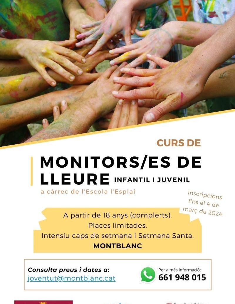 L’Ajuntament de Montblanc amb la col·laboració de l’Oficina Jove de la Conca de Barberà impulsa un curs de monitor/a d’activitats d’educació en el lleure infantil i juvenil que es realitzarà de forma intensiva per Setmana Santa i alguns caps de setmana previs i posteriors. Aquesta formació, que impartirà l’Escola de l’Esplai, va adreçada a persones joves a partir de 18 anys que estan interessades en treballar com a monitores de lleure en l’àmbit escolar, de lleure i d’oci en general.