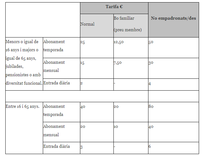 En el quadre següent es fixen els preus dels abonaments i dels bons familiars tal i com es regula en l’ordenança fiscal 21: