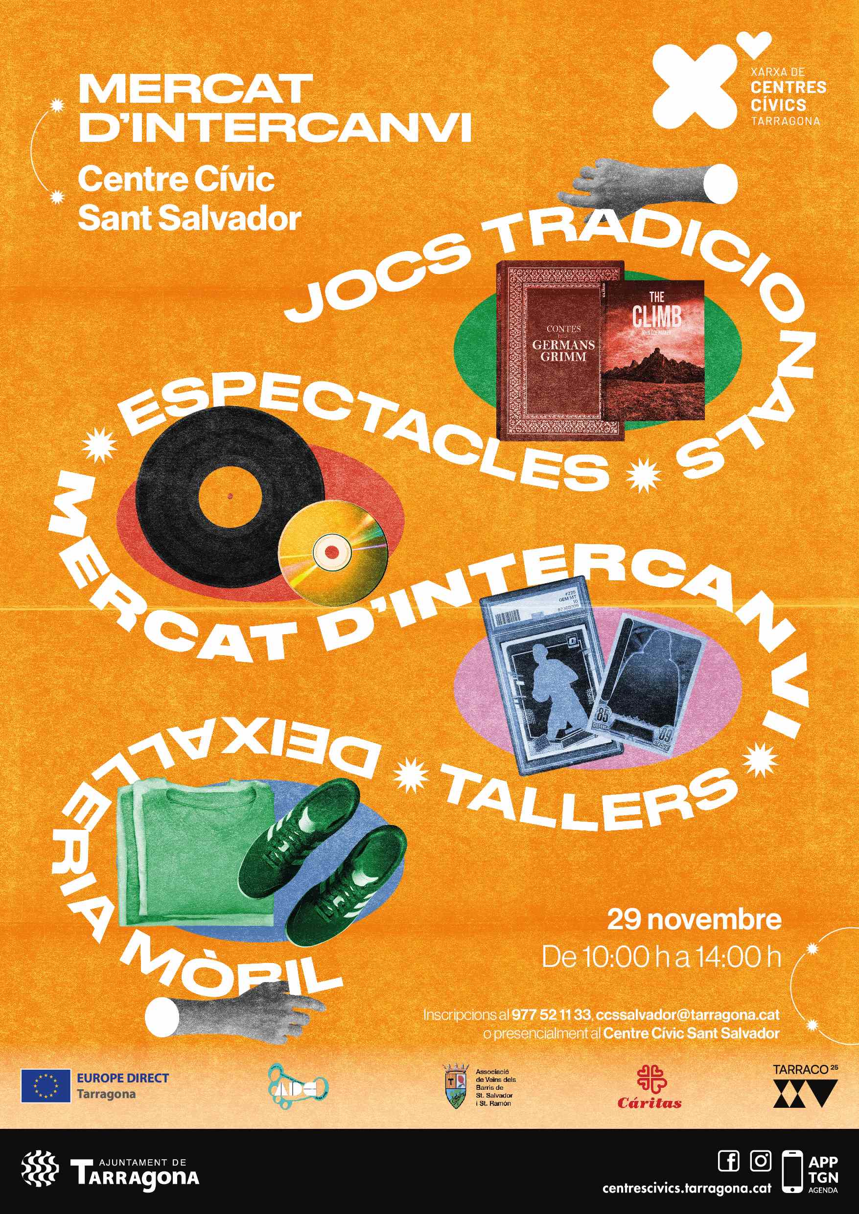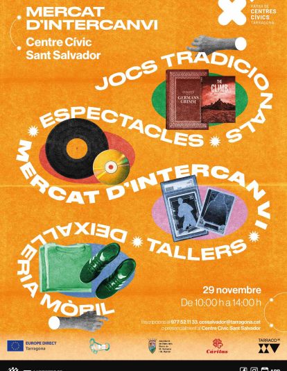 Aquest dissabte 29 de novembre tindrà lloc el primer Mercat d'Intercanvi de la Xarxa de Centres Cívics de Tarragona, un mercat que es farà al Centre Cívic Sant Salvador i en el qual es podran intercanviar productes de segona mà i en bon estat. Des de les 10 fins a les 14 hores, s'intercanviarà roba, llibres, cromos i articles musicals com són CDs, cassets, instruments i partitures.