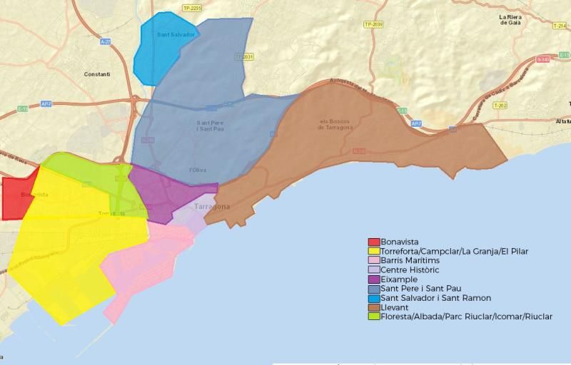Al centre de Tarragona hi hauria tres regidories de barris: una que englobaria els Barris Marítims (Serrallo, Torres Jordi i barri del Port); l’altre regidor serviria als veïns i veïnes dels eixamples sud i nord (inclosos el Parc del Francolí i barri del Carme); i el darrer pel centre històric de la ciutat i la Part Alta.