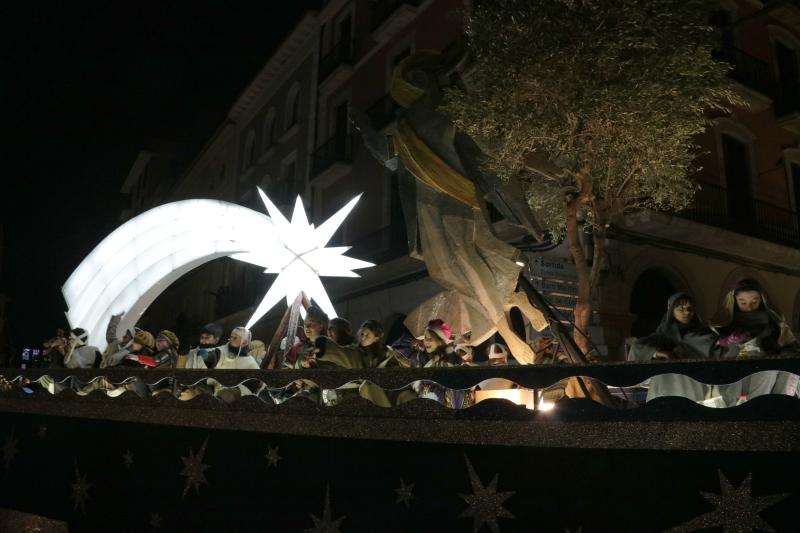 Guiats per la carrossa de l'Estel fins a la plaça de la Font, Ses Majestats han rebut de mans de l'alcalde Rubén Viñuales les claus de totes les cases de la ciutat per entregar regals aquesta nit.