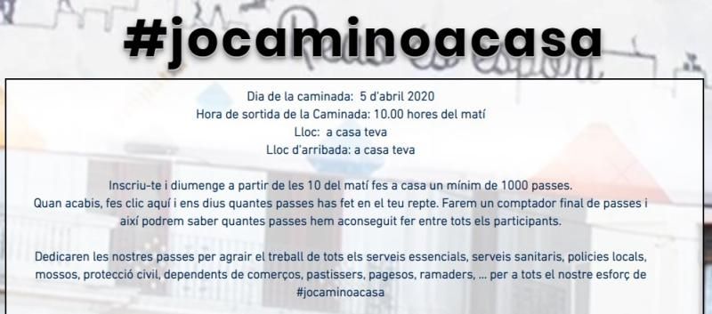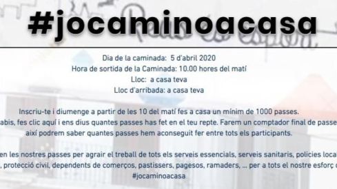 Davant la situació de confinament de la població i amb l’objectiu de dinamitzar activitats saludables la regidoria impulsa per a aquest diumenge una caminada popular a casa, que s’inclourà al calendari de d’activitats fisícoesportives de caràcter obert i participatiu de l’any 2020. Amb el lema #jocaminoacasa l’activitat serà aquest diumenge dia 5 d’abril, a les 10:00 h del matí.