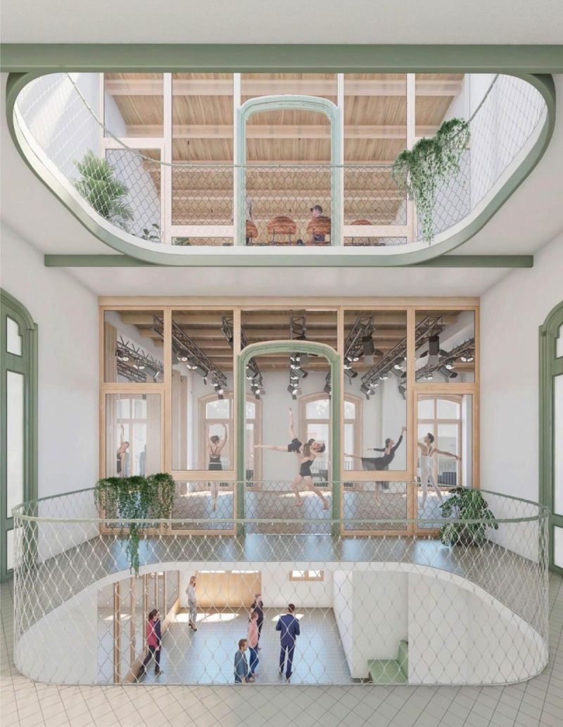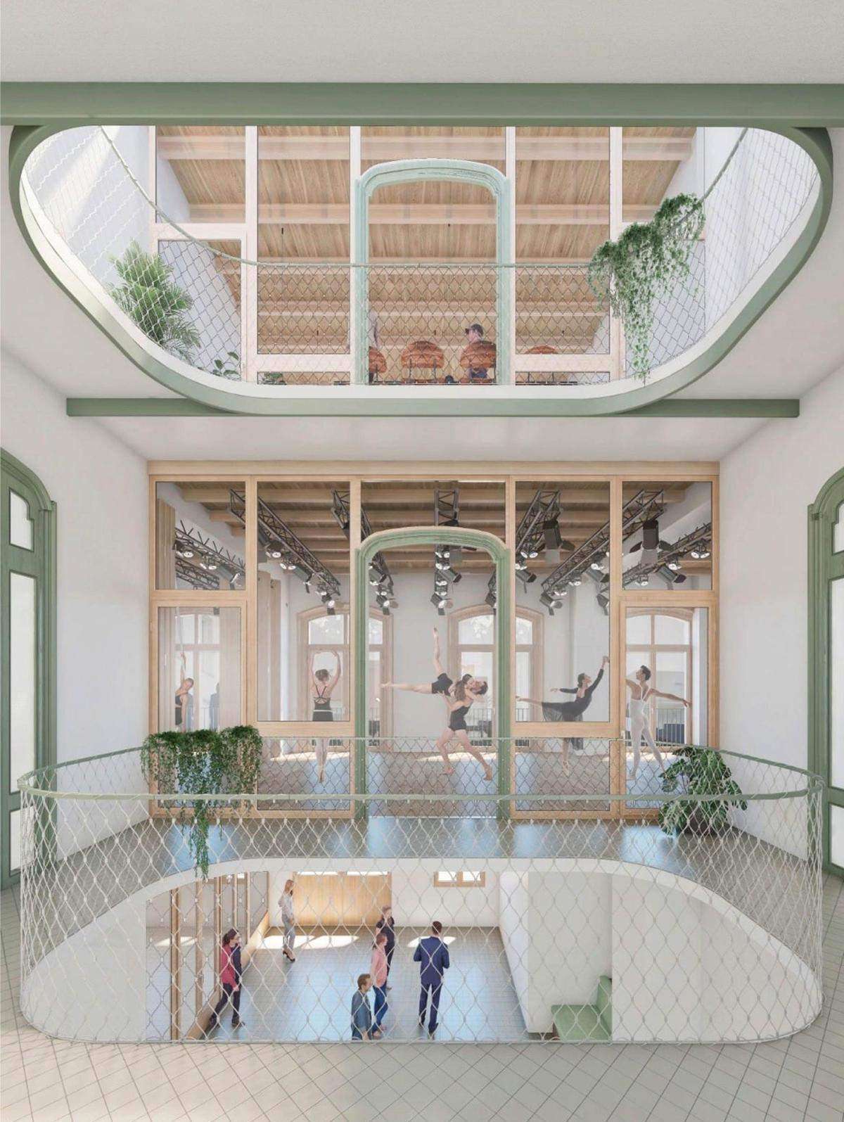 - L’Atri: La principal estratègia de la proposta tracta de generar un centre, un espai de trobada, un cor social, que representa el paper aglutinador que l’equipament vol tenir entre tots els agents culturals i escènics de la ciutat. S’emmiralla amb el lluernari de l’escala que dota de qualitat espacial a l’edifici, que organitza les circulacions i que inunda de llum el centre de l’immoble, especialment el vestíbul de planta baixa i les sales de planta primera. A més, tindrà també una funció climàtica. Permetrà, a l’hivern, escalfar l’edifici de manera gratuïta gràcies a l’efecte hivernacle, i, a l’estiu refrescar l’edifici de manera natural gràcies a l’efecte venturi.
