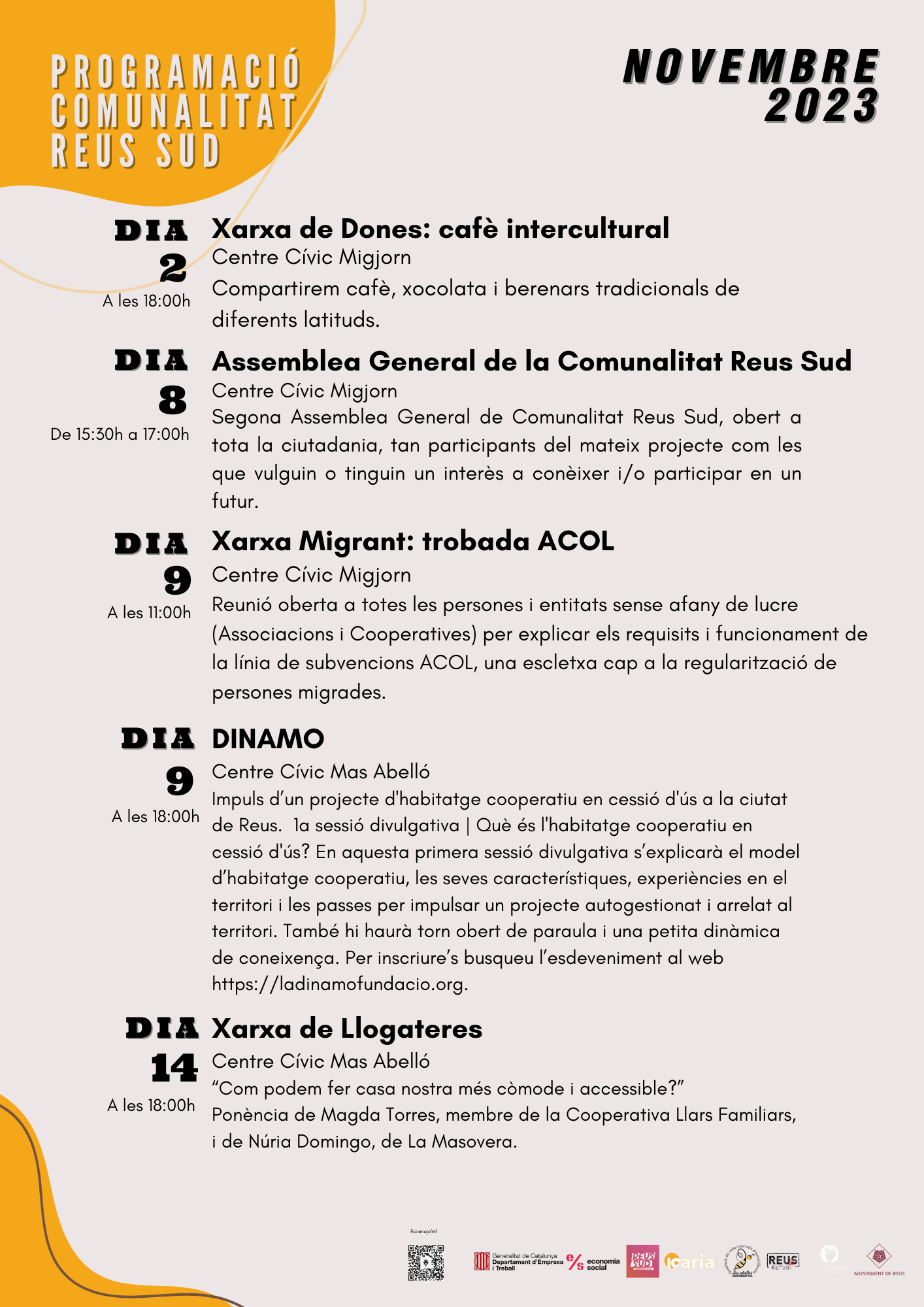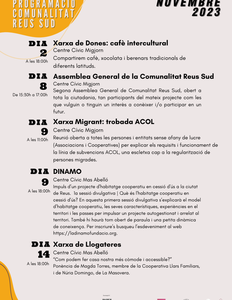 I finalment, el dijous dia 9 es portarà a terme una sessió per impulsar l’habitatge cooperatiu a Reus, juntament amb La Dinamo, al Centre Cívic Mas Abelló a les 6 de la tarda.