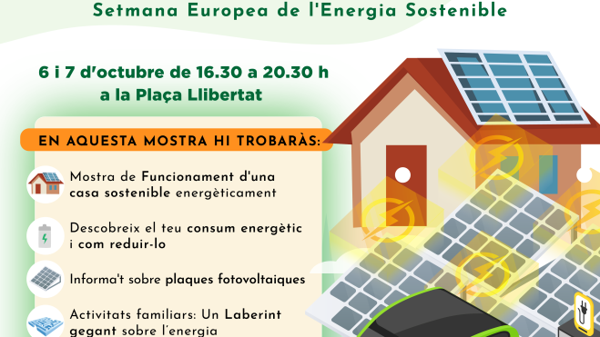 Al llarg de les tardes del 6 i el 7 d’octubre, en horari de 16.30 a 20.30 hores, la plaça de la Llibertat serà l'escenari de diverses activitats familiars i la mostra d'iniciatives sostenibles i d’estalvi energètic. Les persones assistents podran visitar una casa energèticament sostenible. Es tracta d’un habitatge totalment autònom en matèria d’energia elèctrica gràcies a l’aprofitament de l’energia solar amb plaques fotovoltaiques i de la connexió a un vehicle elèctric que fa la funció de bateria i alimenta l’habitatge a les hores que no hi ha sol. Aquesta llar també incorpora una petita exposició amb consells d’estalvi energètic.