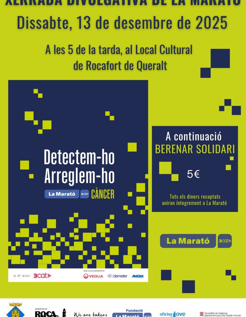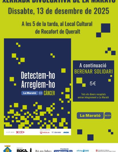 El dissabte 13 de desembre, a les 5 de la tarda, al Local Cultural de Rocafort de Queralt, tindrà lloc la xerrada divulgativa de la Marató de TV3, que enguany dedicarà la seva capacitat de sensibilització i mobilització al càncer, per tots els reptes que encara planteja la malaltia i pel seu profund impacte en la nostra societat.