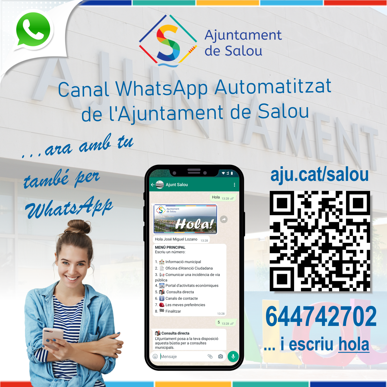 Per poder fer servir aquest nou canal de comunicació amb l'Administració és necessari guardar el contacte a l'agenda (644 742 702), i escriure "hola", a través de WhatsApp.