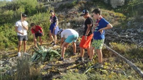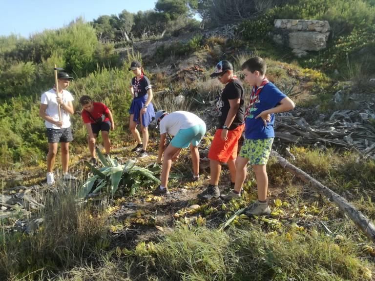El Grup Scout Àguiles d’Alacant ha finalitzat, amb èxit, la seva missió de realitzar tasques de voluntariat al Cap Salou, entre la Platja Llarga i la cala Penya Tallada. Així, durant tres dies, des de divendres, 19 de juliol, a dilluns 22 de juliol, els 13 nens i nenes i les dues monitores han recollit un total de 13 metres cúbics de la planta invasora ungla de gat, coneguda científicament com Carpobrotus edulis, una espècie que si no es controla ocupa l’hàbitat de la planta endèmica Limonium giberti. Els voluntaris han netejat els espais verds públics de costa, en una iniciativa que compta amb el suport de Medi Ambient de l’Ajuntament de Salou.