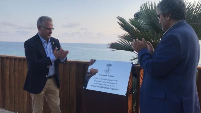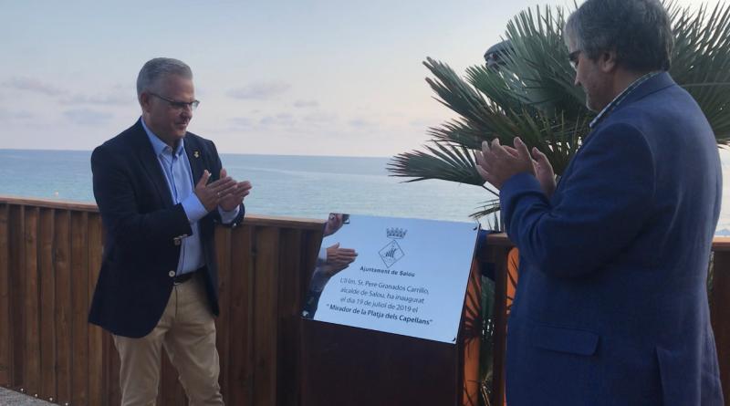 L’alcalde de Salou, Pere Granados, acompanyat pel vicepresident primer de la Diputació de Tarragona, Joaquim Nin, ha descobert aquest vespre la placa que inaugura el Mirador de la Platja dels Capellans.