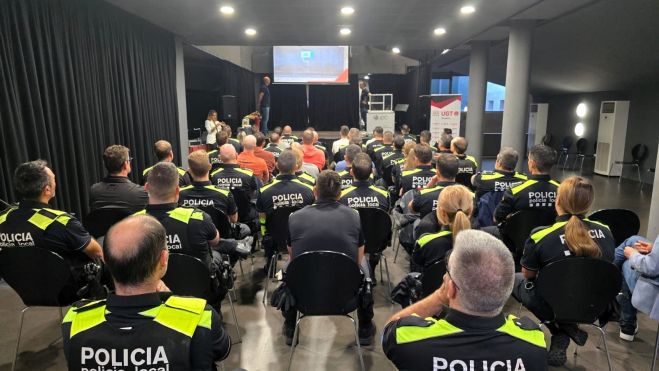 Una seixantena d’agents de diverses policies locals del territori han participat aquest dimecres al matí en una jornada de formació sobre actuacions en emergències, que ha tingut lloc a l’Espai Cultural Sala del Mar de Torredembarra. Aquesta formació s’ha centrat en la resposta davant incendis en habitatges i vehicles elèctrics, així com en actuacions inicials amb víctimes i actuacions d’emergència fins a l’arribada del personal sanitari. La sessió ha estat impartida per Bombers i per tècnics del SEM, i ha inclòs simuladors de foc real.